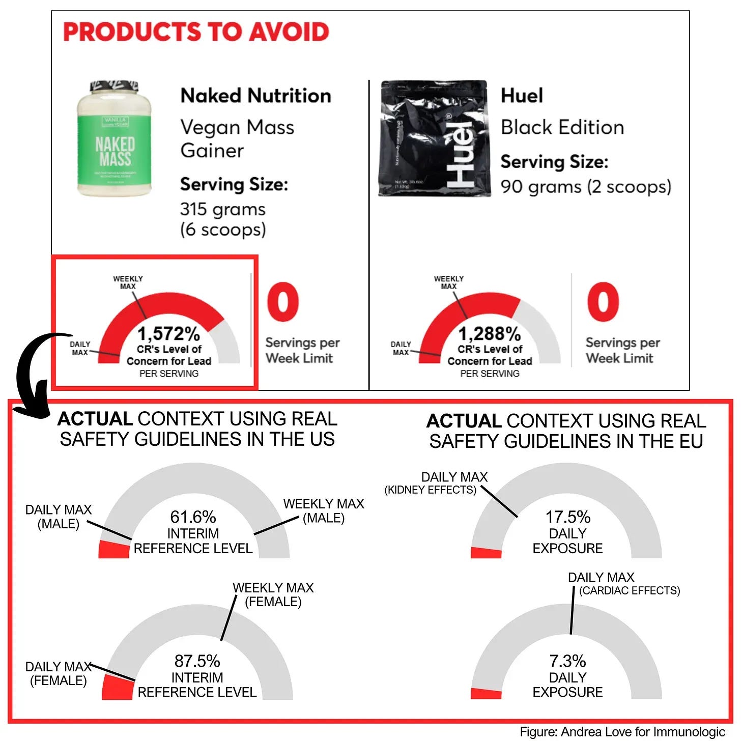 Ví dụ, sản phẩm Naked Vegan Mass Gainer, được ghi nhận chứa hàm lượng Chì cao nhất trong số những sản phẩm được đánh giá (7.7 mcg/serving), vẫn thấp hơn so với mức IRL cho phụ nữ trong độ tuổi mang thai (8.8 mcg/ngày, 87.5%) và nam giới (12.5 mcg/ngày, 61.6%). Nếu so sánh với tiêu chuẩn của EU (có thể coi là chặt chẽ hơn), hàm lượng trên thấp hơn rõ rệt so với ngưỡng lo ngại về Thận và Tim mạch (ở một người nặng 70kg, lần lượt 44mcg/ngày và 150mcg/ngày). Thậm chí, ngưỡng kiểm soát an toàn về Chì của EU (3 mg/kg hay 3 mcg/g) cao hơn gấp 123 lần so với hàm lượng trong sản phẩm này (tính theo serving 315g của sản phẩm, 945 mcg/serving).
