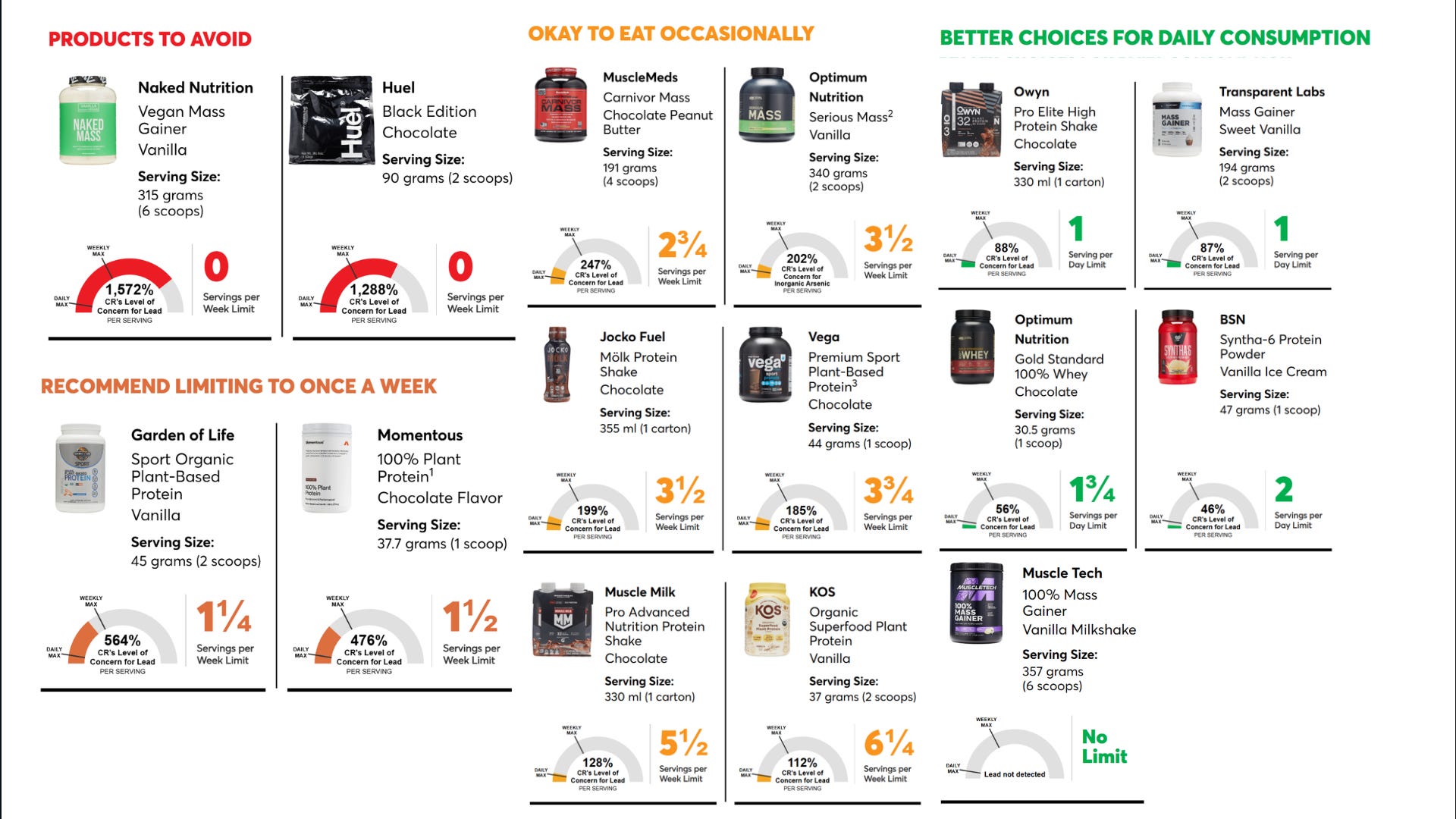 Các dòng tít truyền thông tập trung vào phát hiện rằng, hơn 2/3 sản phẩm được đánh giá chứa hàm lượng Chì (Pb) vượt quá ngưỡng 0.5 mcg/ngày (1 mcg = 1000 mg) tính trên mỗi khẩu phần (serving) - ngưỡng được CR lựa chọn làm ngưỡng tiêu chuẩn an toàn. Đặc biệt, hai sản phẩm cụ thể Protein có nguồn gốc thực vật chứa đến 7.7 và 6.3 mcg/serving.