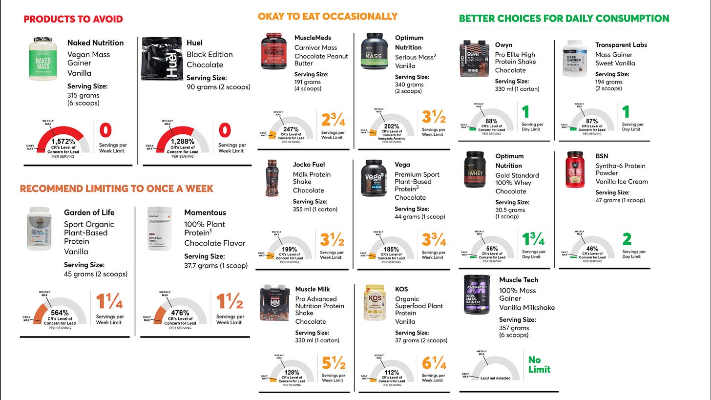 Consumer Reports (CR), một nhóm vận động hành lang tại Mĩ, gần đây công bố rằng, họ thử nghiệm 23 sản phẩm thực phẩm bổ sung Protein dạng bột, hay bột Protein, có nguồn gốc từ sữa, thịt bò, và thực vật, để đánh giá hàm lượng Chì cũng như các loại kim loại nặng khác.