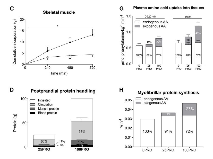 Tiêu thụ lượng Protein lớn hơn đòi hỏi thời gian dài hơn để tiêu hóa hết, nhưng cũng tương ứng với thời phản ứng đồng hóa diễn ra lâu hơn, và theo đó dẫn đến lượng Protein được sử dụng để tích lũy vào cơ bắp cao hơn. 100g Protein khiến phản ứng tổng hợp Protein cơ bắp tăng cao trong suốt thời lượng theo dõi (12 tiếng) và chưa có dấu hiệu dừng lại (trong khi phản ứng với 25g Protein đã chững lại ở ~ 8 tiếng). Hoạt động này diễn ra độc lập với các hoạt động truyền tin tế bào (chỉ kéo dài chưa đến 4 tiếng).