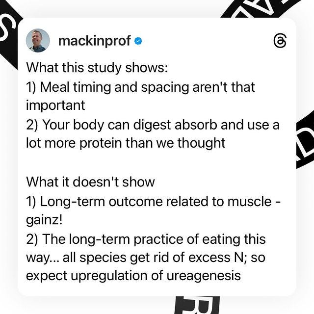 🔗Một điều thú vị là trong quá khứ mình có thực hiện một video trên Tiktok về chủ đề ‘ngày ăn một bữa có tăng cơ tốt không’, nêu ra những lí do trên lý thuyết cũng như thực tiễn để lập luận rằng ăn ít nhất 3 bữa/ngày sẽ là phương án có lợi hơn. Nghiên cứu hiện tại nhìn chung không làm thay đổi đáng kể quan điểm của mình, nhưng nó cũng góp phần củng cố sự thay đổi quan niệm của mình về một số vấn đề, vd. như về hiện tượng “no cơ” sau bữa ăn.