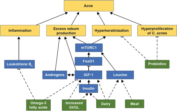 Hai sơ đồ khác nhau minh họa ảnh hưởng của các yếu tố trong chế độ ăn đến các cơ chế sinh lý bệnh khác nhau của mụn viêm. Một lưu ý là đây chỉ là những cơ chế tiềm tàng và không phải lúc nào cũng phản ánh thực tế, như mối liên hệ giữa thịt (Meat) và phát sinh Mụn thông qua con đường kích hoạt mTOR có rất ít bằng chứng ủng hộ.