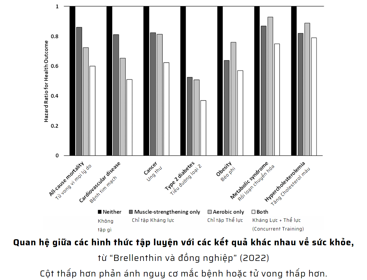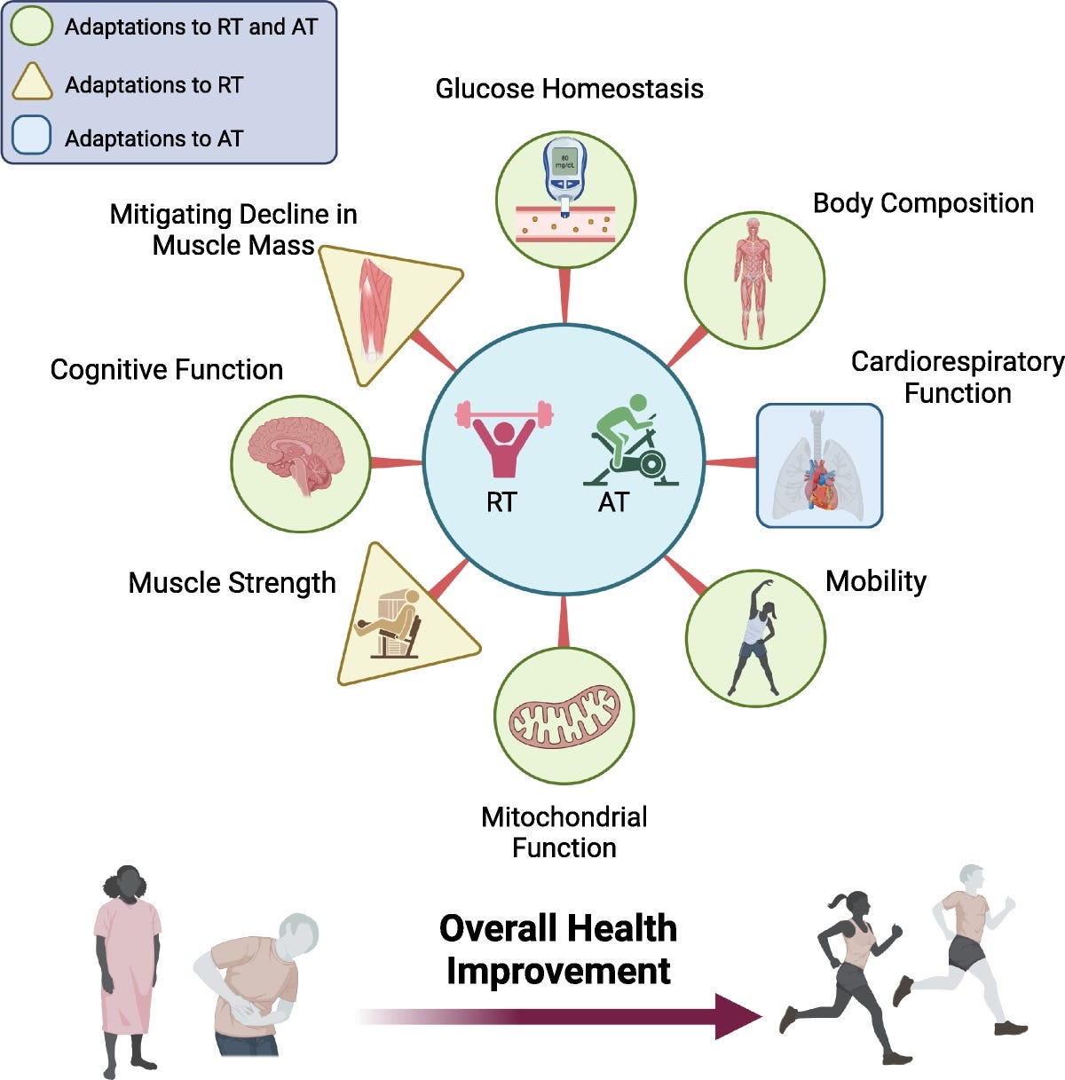 Những lợi ích đối với sức khỏe ở người cao tuổi chỉ đến từ tập luyện Kháng Lực (tam giác), tập luyện Thể lực (vuông) hay có thể đến từ cả hai hình thức tập luyện này (tròn). Nguồn: Sawan và đồng nghiệp (2023)