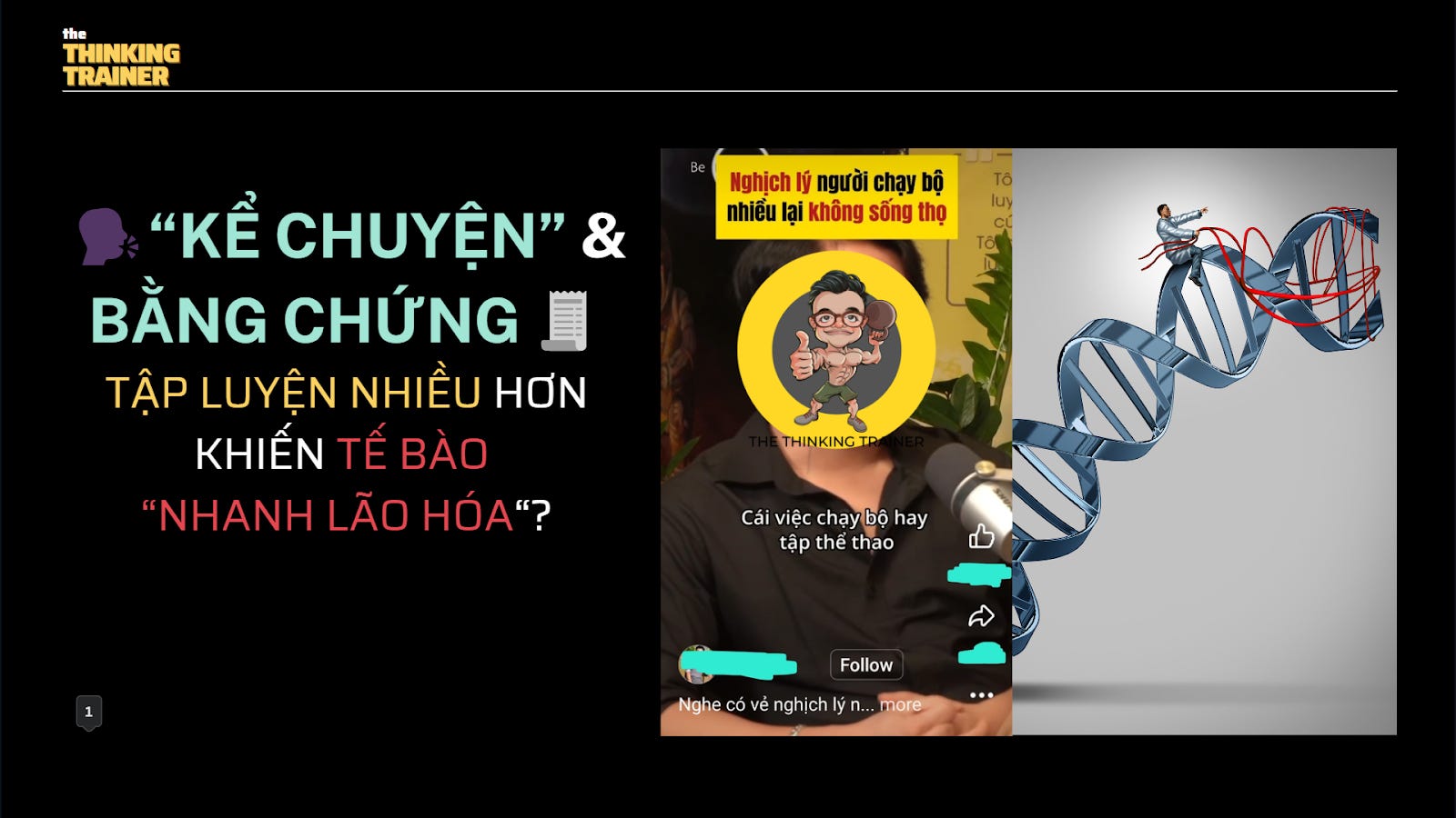 Tập luyện dường như ‘ăn điểm’ ở cả hai khía cạnh này: vừa tạo ra ‘động lực’ hay kích thích để cơ thể phát triển (thông qua áp lực đến các hệ cơ quan trong cơ thể), nhưng cũng vừa tạo ra những hiện tượng được liên hệ với tổn thương ở trên (vd: viêm, áp lực oxy hóa) trong ngắn hạn. Vì vậy, theo logic của diễn giả, tập luyện đẩy nhanh tốc độ ‘thay thế tế bào’.