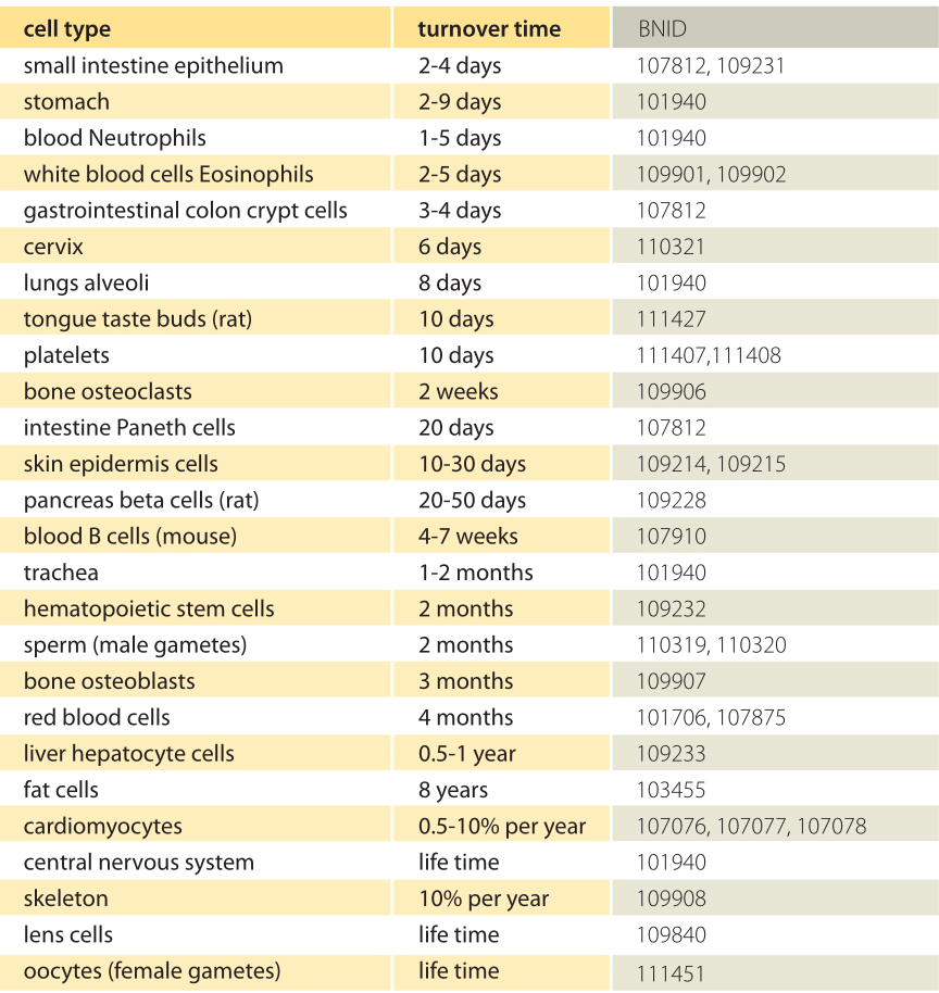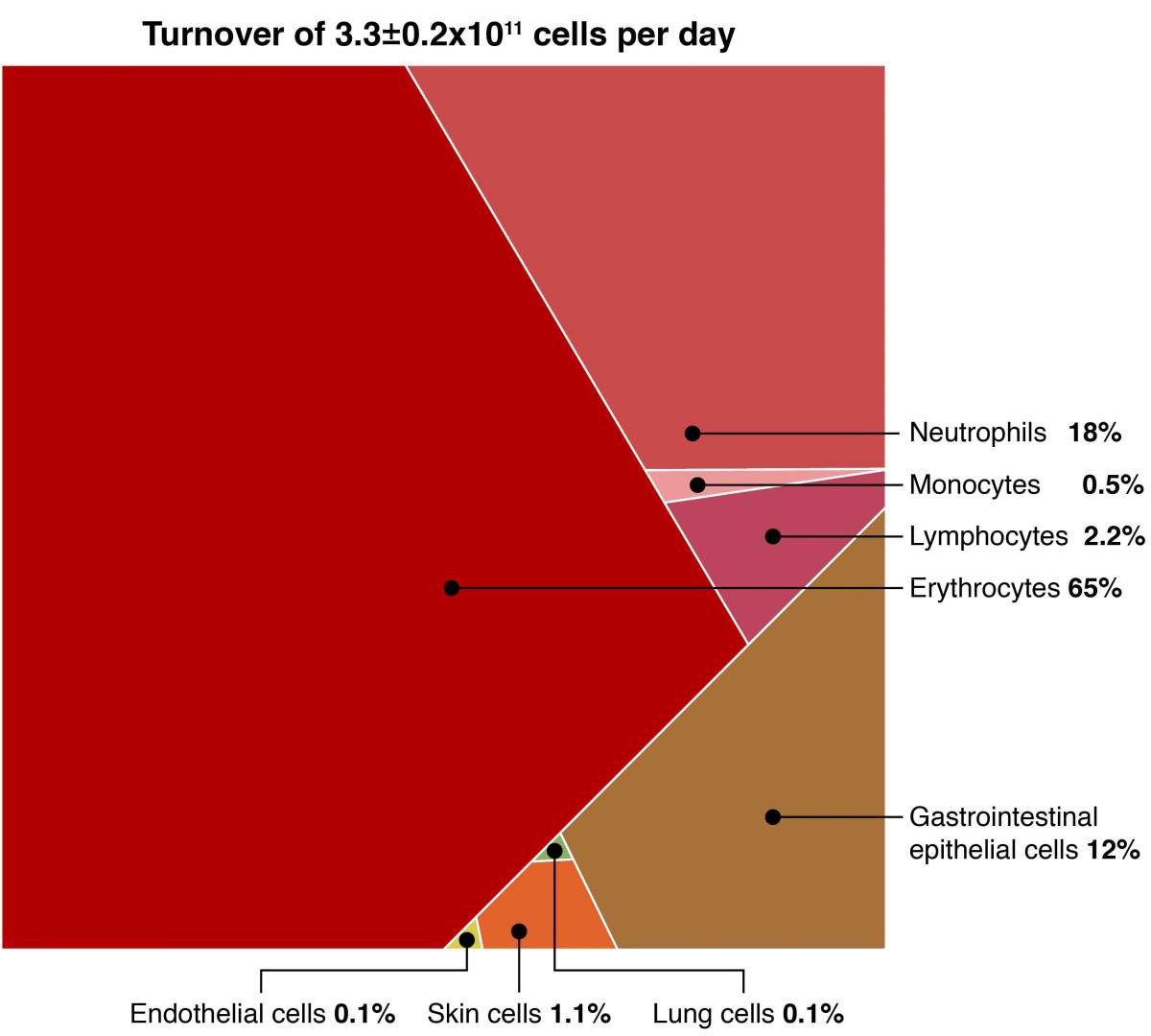 Trước hết, mỗi loại tế bào có một tuổi thọ nhất định, từ vài ngày (như tế bào biểu mô dạ dày) đến vài năm (như tế bào cơ tim hay tế bào thần kinh). Như một nghiên cứu ghi nhận, ước tính cơ thể thay thế ~ 330 tỉ tế bào/ngày, với 3 loại tế bào chiếm tỉ lệ lớn nhất (95%) là tế bào hồng cầu (65%), bạch cầu trung tính (18%), và tế bào biểu mô dạ dày (12%).