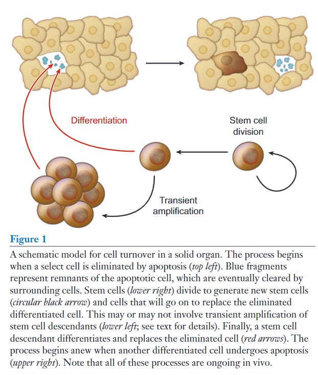 Mặt khác, khoảng trống của tế bào vừa bị loại bỏ vẫn cần được khỏa lấp. Đây là tình huống mà hiện tượng phân chia tế bào, hay “phân bào” (cell differentiation hay cell division) nhập cuộc. Để làm điều này, tế bào gốc (stem cells) phân thân thành hai tế bào mới: một tế bào ‘hậu duệ’ tiếp tục đóng vai trò tế bào gốc, và tế bào còn lại thế chỗ cho tế bào vừa ‘về bãi phế liệu’.
