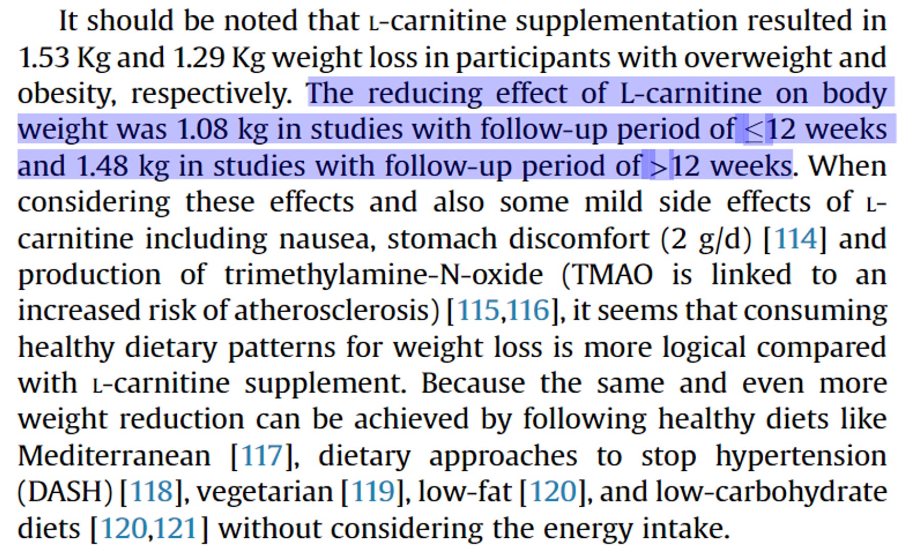 Như đã thảo luận trong một bài viết trước đó, trong khi thúc đẩy “đốt mỡ” là một cơ chế phổ biến, “đốt mỡ” không đồng nghĩa với “giảm mỡ”, và việc cơ thể tăng đốt chất béo làm năng lượng gần như vô nghĩa cho mục tiêu giảm mỡ nếu thiếu trạng thái “thâm hụt năng lượng”. Điều này có thể giải thích được kết quả khá mờ nhạt của L-Carnitine (dạng uống) đối với cân nặng và lượng mỡ trên cơ thể, rõ rệt nhất trên những đối tượng thừa cân, béo phì, nhưng khá đáng thất vọng nếu so sánh với các biện pháp trực tiếp tạo ra thâm hụt năng lượng thông qua điều chỉnh chế độ ăn và thói quen sinh hoạt.