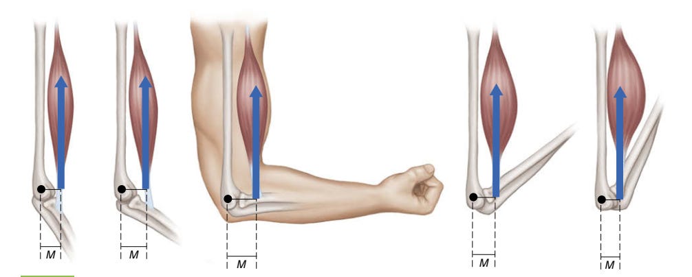 Cùng một chuyển động của Xương quanh Khớp - ví dụ chuyển động Gập khớp Khuỷu tay (Elbow Flexion) khi tập bài Biceps Curl - có sự tham gia đồng thời bởi nhóm cơ khác nhau cùng tạo ra chuyển động đó (các nhóm cơ “chủ vận” hay agonist). Tùy vào vị trí và điểm bám, mỗi nhóm cơ này sẽ có khả năng sản sinh lực để tạo ra chuyển động khác nhau, phản ánh bởi khái niệm ‘momen’ khớp (joint moment) và ‘cánh tay đòn’ (moment arm). Nhóm cơ với ‘cánh tay đòn’ lớn hơn sẽ ở vị trí thuận lợi hơn để phát lực (hay có ‘lợi thế cơ học’ hay mechanical advantage); đây là một yếu tố chính quyết định nhóm cơ ‘chủ vận’ nào đóng góp nhiều nhất vào sản sinh lực chính để tạo ra chuyển động.