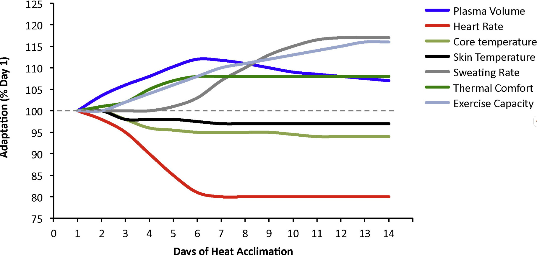 Chủ đề này trước đó đã được thảo luận khi chúng ta bàn về “tập Chạy bộ trong thời tiết nóng ẩm”. Để tóm tắt lại: khi vận động trong thời tiết nóng (nhiệt độ cao, và đặc biệt độ ẩm cao), thân nhiệt của cơ thể tăng lên (do hoạt động sản sinh và tiêu thụ năng lượng), và để duy trì thân nhiệt ở mức ổn định, cơ thể cần giải phóng bớt nhiệt lượng này ra ngoài môi trường - một cách mà nó làm điều này là đổ mồ hôi. Điều này dẫn đến hệ quả là cơ thể thất thoát huyết tương (plasma hay phần chất lỏng của máu), dẫn đến tim làm việc với công suất cao hơn để tống máu (và Oxy) đến cơ bắp cần tiêu thụ. Mặt khác, trong dài hạn, cơ thể sẽ thích nghi thông qua những biểu hiện như tăng lưu lượng huyết tương máu (plasma blood volume) và giảm nhịp tim (trở về mức bình thường), bên cạnh những thích nghi khác - đây là khái niệm “thích ứng nhiệt” (heat acclimation).