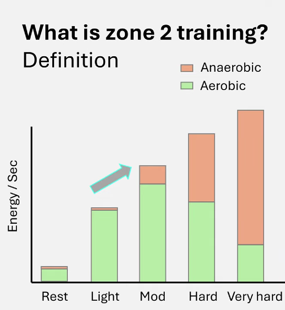 Tập luyện ở cường độ thấp hơn đóng vai trò xây “nền móng” cho thể lực, thông qua thúc đẩy những thích nghi như tăng khả năng bơm máu của Tim (vận chuyển Oxy và chất dinh dưỡng, cũng như thanh thải phụ chất chuyển hóa) và tăng lượng Ti thể trong cơ bắp; nói cách khác, nếu so sánh với một khối động cơ, xây dựng khối động cơ “hiếu khí” lớn hơn, có khả năng chứa, vận chuyển và đốt nhiên liệu lớn hơn.