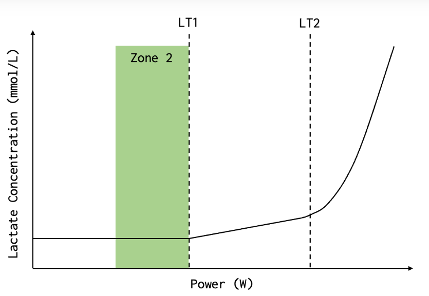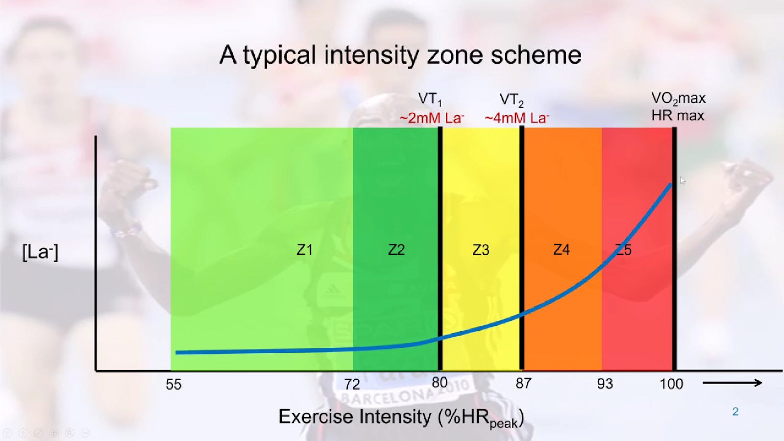 Vậy Zone 2 (Z2) nằm ở đâu? Cường độ tập luyện Thể lực thường được chia làm 5 Zone (Zone 1 - 5). Z2 được xác định bởi ngưỡng cường độ được ghi nhận có hiện tượng gia tăng đáng kể hoạt động chuyển hóa “yếm khí” đầu tiên - là giới hạn “trần” của Z2 - khi vận động hay tập luyện. Ở Z2, chuyển hóa “hiếu khí” vẫn đóng vai trò cung cấp năng lượng chính cho hoạt động tập luyện, phản ánh bởi lượng Lactate cơ thể sản sinh vẫn tương đối ổn định.