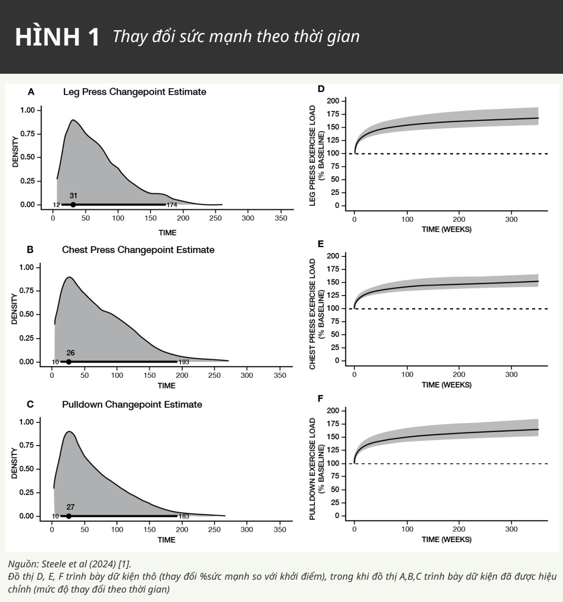 May mắn là, chúng ta có một nghiên cứu mới công bố gần đây trực tiếp trả lời câu hỏi này. “Steele và đồng nghiệp” theo dõi gần 15000 người tập, chỉ tập đúng 1 Set/tuần đến thất bại dưới sự hướng dẫn của HLV, từ khi họ mới bắt đầu tập đến trung bình 6-8 năm sau. Kết quả cho thấy, những người tham gia đạt được tiến bộ tốt nhất trong 1-2 năm đầu tiên, sau đó tốc độ tiến bộ chậm lại rõ rệt và gần như chững lại tại thời điểm 6-8 năm. Những phát hiện trên đem lại cho chúng ta 2 cái nhìn: